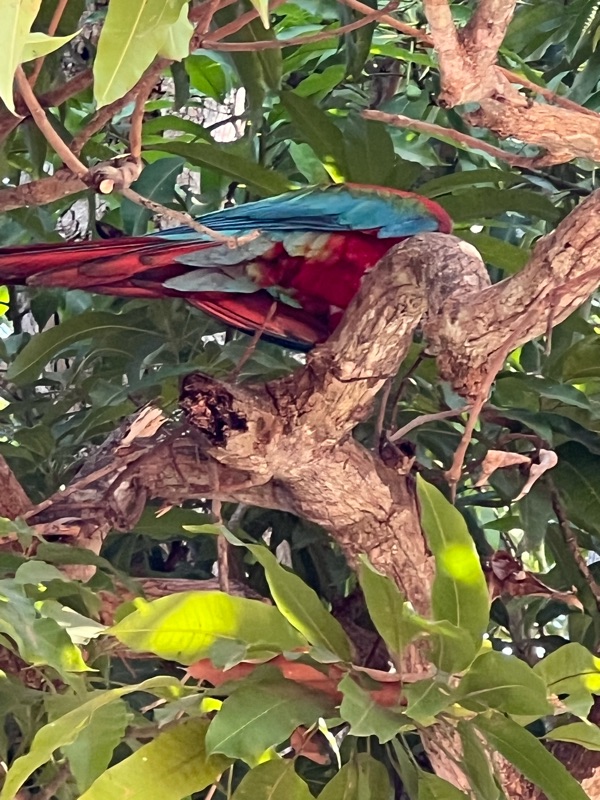 After a flight and a three hour drive on dirt roads (only 8 miles of it was bumpy), we arrived at our “resort” on the river that had little concrete cabins distributed over a large campus. The big field next to the common areas was full of large birds, and in the trees were several wild macaws. Unfortunately it was also really hot!