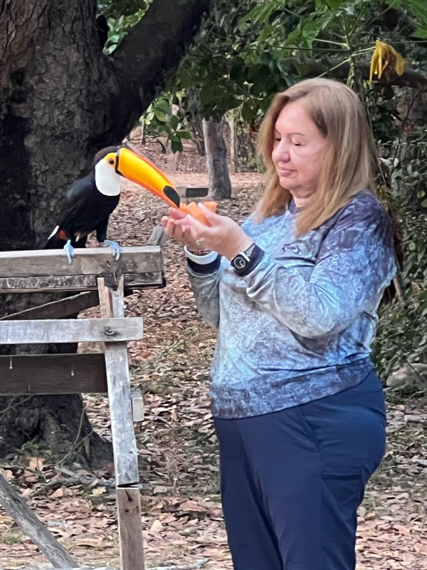 There were many day and evening river exploration trips in the two “canoes,” the eight to ten person low power boats that cruised along the river banks. We saw lots of animals including giant river otters and capybara. Another highlight was the many beautiful birds, both along the river and on the resort grounds.