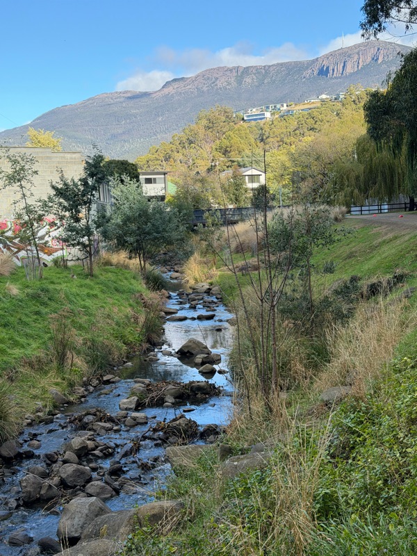 We met most of our tour group at breakfast in the hotel - which was exceptionally delicious. Then we set out on a walk with the aim of finding a duck-billed platypus in the Hobart Rivulet Linear Park. While we didn’t see the sought marsupial, we did see some lovely birds. The morning walk through the trees, along the creek, with the mountains in the distance was just what we needed to shake off the long trip.
