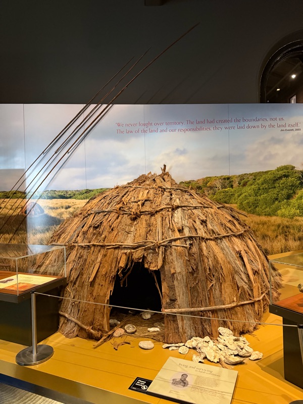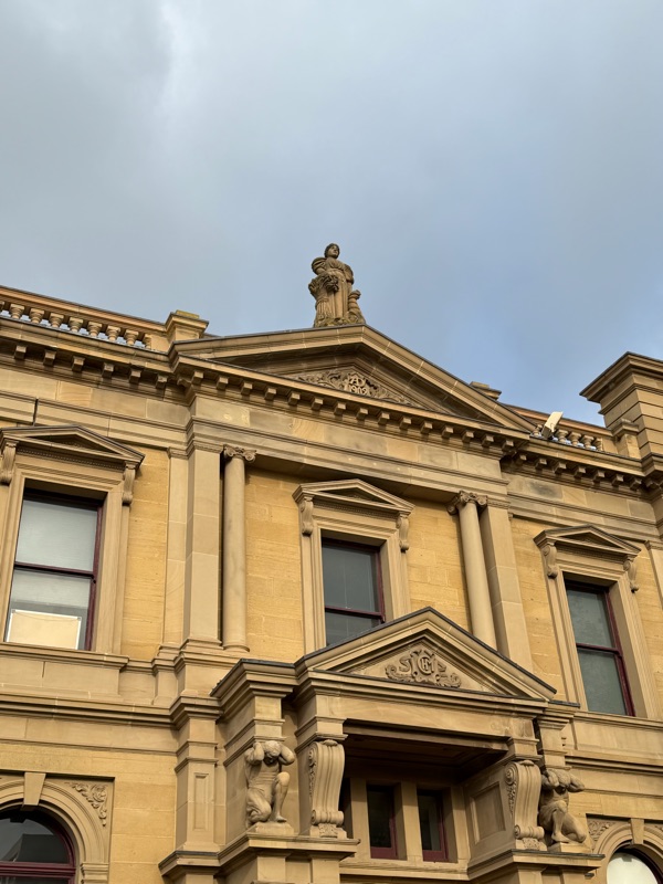 We got back to the hotel around 2, and after a brief pause, strolled over to the Tasmanian Museum and Art Gallery to learn more about the Aboriginal experience in Tasmania with Rod, our tour leader. The indigenous population had been completely isolated from other people since the end of the last Ice Age about 11,000 years ago. The arrival of the British government and settlers forced the indigenous population off of their land, over time leading to their eradication in Tasmania (from disease or other causes), wiping out the indigenous culture almost entirely. Some information of the culture is being recovered through archaeological findings, but it is significant that the determination of who is an aboriginal is made not by ancestry but by behavior. It was moving and sad to see the exhibits and gain some understanding of what has been lost.