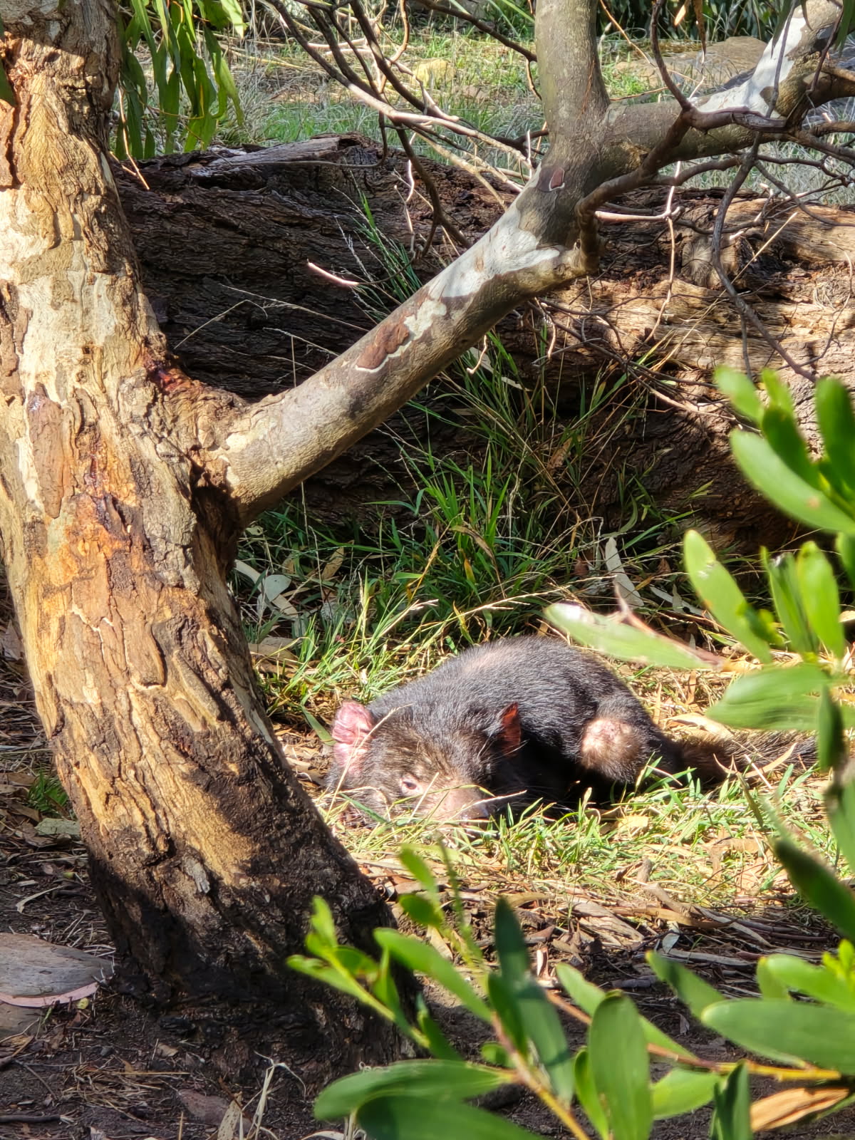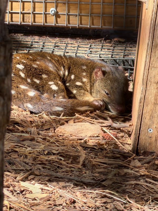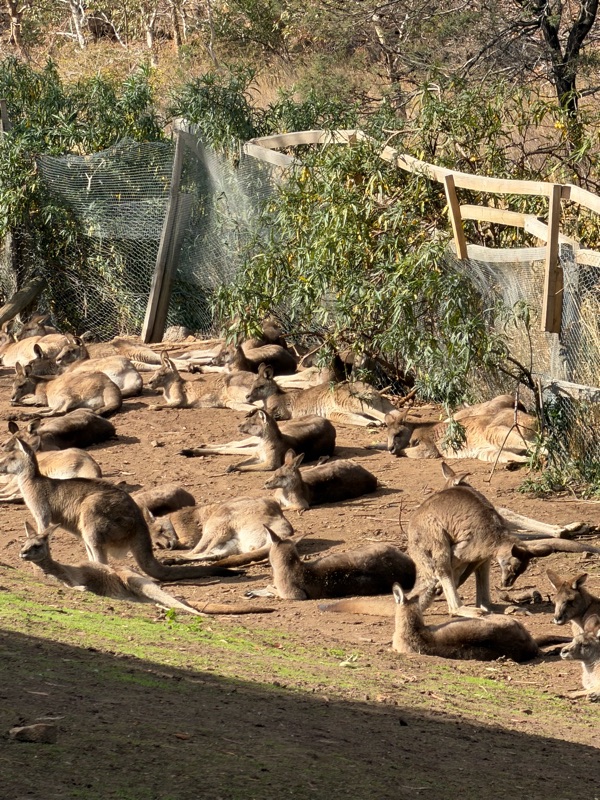 After the tour, we continued to walk around, seeing the famous Kookabera (who sits in a gum tree), kangaroos, more Tasmanian Devils, (so named because of their horrific screeching, red eyes ears), spotted quolls, and many other birds. It was fun, but we were disappointed that we didn’t get a chance to feed the kangaroos with Roo Chow.
