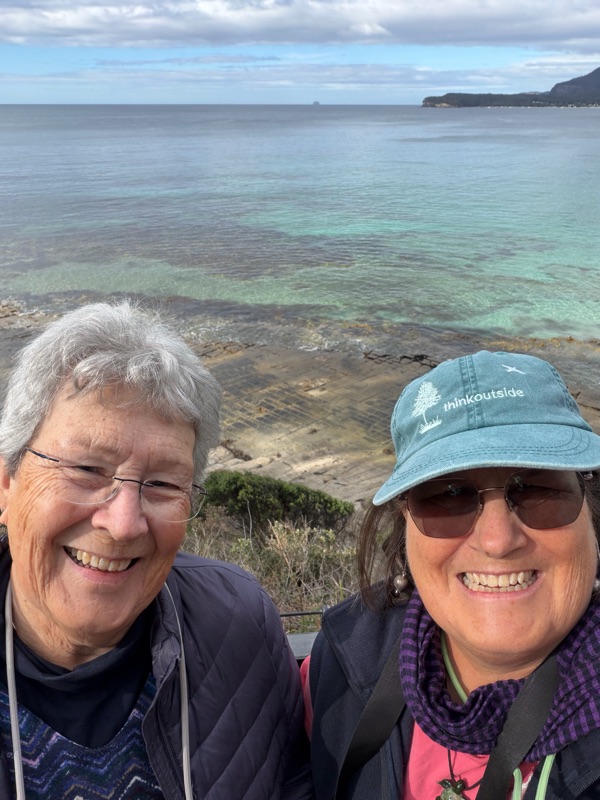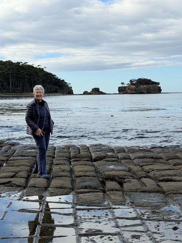 We left the hotel at 9 and drove past lovely scenery - rolling hills and numerous lakes - as we circled around Tiger Head Bay.  We stopped along the way to visit the fascinating Tessellated Pavement State Reserve.  The pavement is an extremely rare geological formation where sedimentary rock is cracked by incursion of salt water forming exact rectangles. Located as it was, with the waves splashing on the shore and amazingly tall eucalyptus trees in the woods behind, it was an amazing light. We loved the site and took lots of