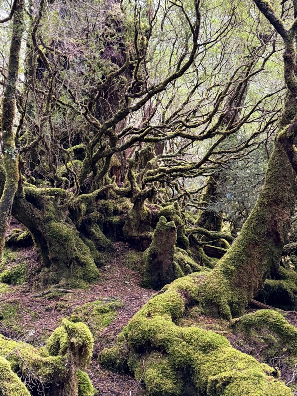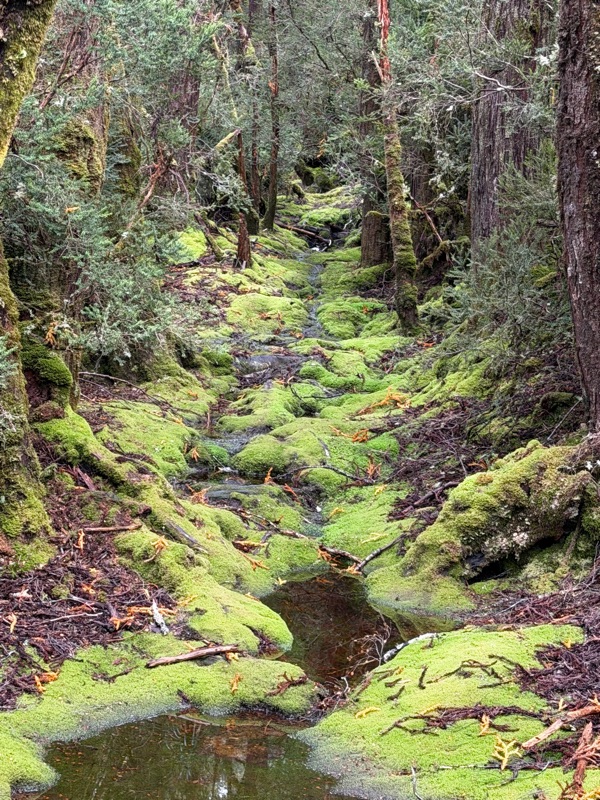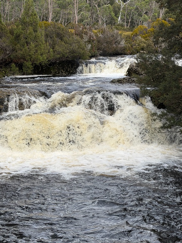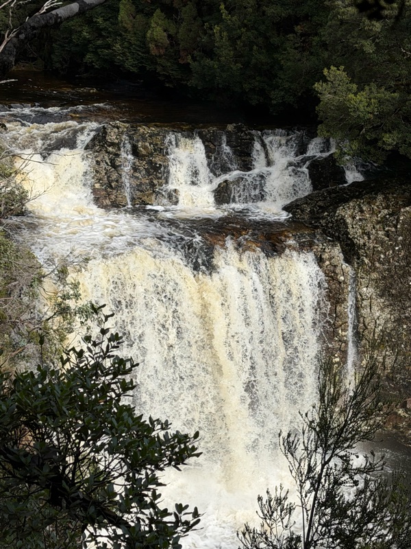 We headed into the park and took a walk along the Pencil Pine river.  This “Enchanted Walk” took us through amazing trees covered in mosses and lichens, past rapids and tree falls.  On the way back in the other side of the river, we saw a family of wallabies, and lots of button grass (the source of the tannins that turn the river tea colored).  We ended up at a lovely waterfall.
